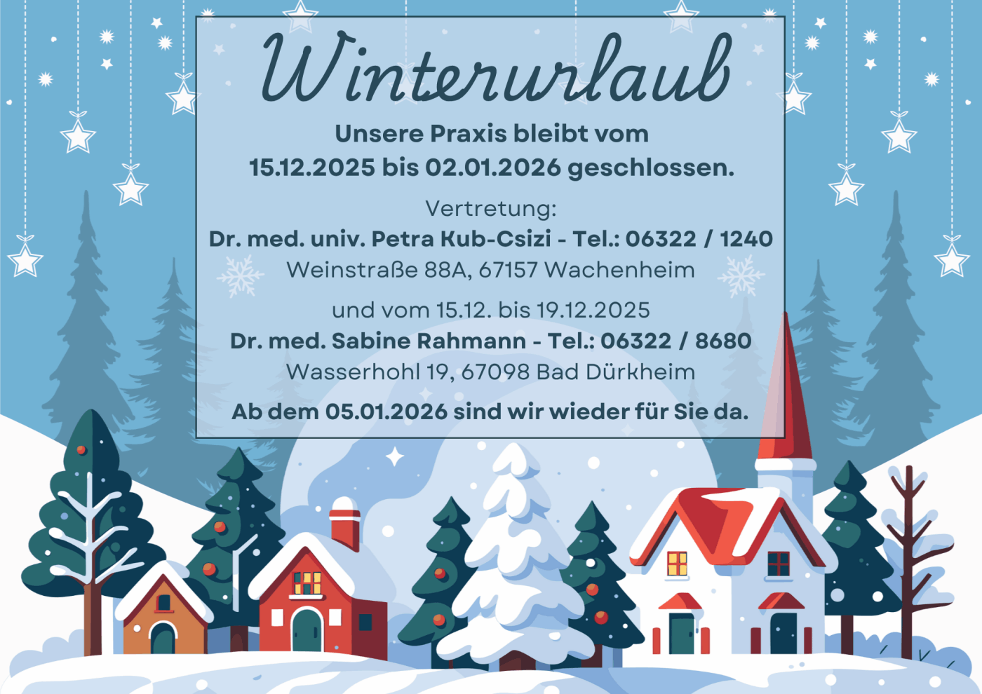 Wir wünschen allen Patienten schöne Feiertage und einen guten Start ins neue Jahr.